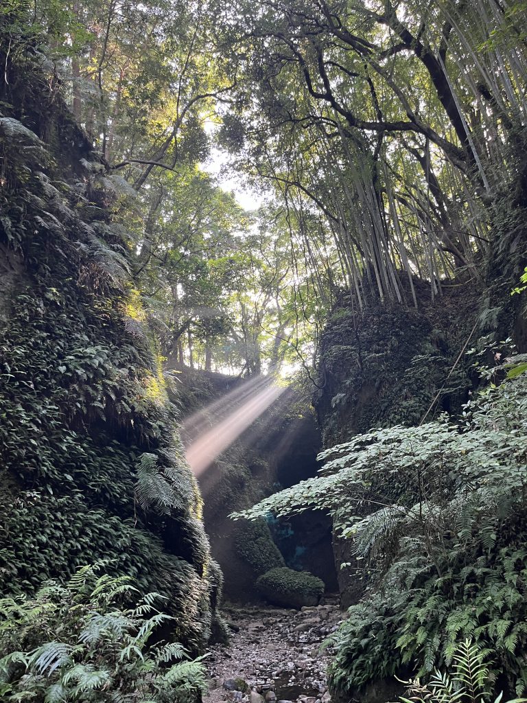 次に紹介するのは伊尾木洞。伊尾木洞は、モネの庭から10分ほど。波の浸食でできた天然の洞窟です。中に入るとひんやりとした空気が広がり、岩肌がしっとりと光っています。洞窟を抜けた先には、シダ植物が一面に広がる幻想的な世界。頭上から差し込む光が緑の葉を照らし、まるでジブリの世界のようでした。足元には小さな流れがあり、さらさらと流れる水の音が耳に心地よく響きます。自然の力を間近に感じられるこの場所では、写真を撮るのも良いですが、少し立ち止まって耳を澄ませてみるのもおすすめです。自然の音に包まれる時間は、都会ではなかなか味わえません。