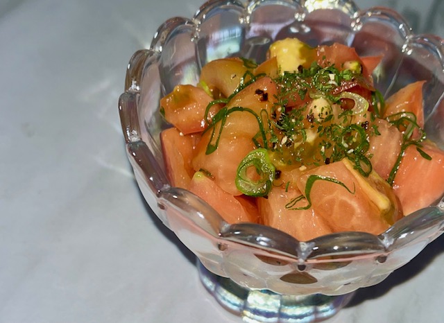 ②トマトと青ネギをボウルに入れてドレッシングをかけ、ホットソース、塩、コショウで味を調える。