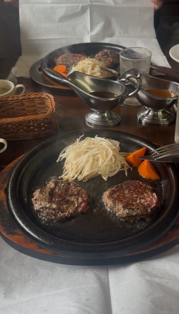 店内は昔から変わることなく木を基調としていいてゆったりとした雰囲気を味わえます。お肉はレアで熱々の鉄板に乗った状態でテーブルに運ばれ、目の前でスタッフが焼いてカットしてくれます。「ジュウッ」と音を立てながら焼かれていき、立ち上る湯気には脂の甘い香りとこんがり焦げたお肉の香ばしさが広がっていきます!