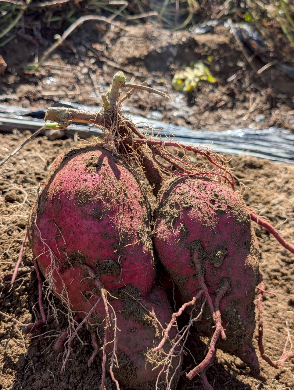 そのあとは芋掘り!土だらけになりながらもたくさんのサツマイモを収穫することができました。途中で大きなムカデが出てきて驚きつつも、無事収穫を終えることができました!収穫できたサツマイモは大きく、掘り起こすのが大変でしたが、おいしそうなサツマイモをお土産にいただきました!そのほかにも横に植えられていたかぼちゃ、佐川町尾川地区の郷土料理である「きらずもち」をいただきました。
