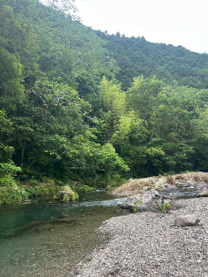 トレジャーハンティングの後には、石窯で焼く手作りピザ体験を行いました!生地を伸ばして具材を乗せるだけ…と思いきや、これがなかなか難しい!特に生地を均等に伸ばすことが難しく、薄くしすぎて破れてしまったり、反対に分厚くなりすぎてしまったりしました。でも、尾川の自然の中で食べるピザは絶品でした。