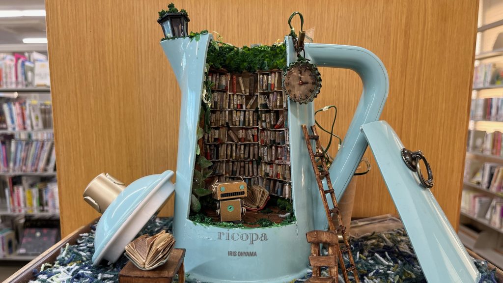 先日久しぶりにこの図書室に行くと、とてもかわいいミニチュアが入口から入ってすぐ視界に入る場所に飾ってあった。これはこの図書室の職員さんの手作り作品だ。「森の中の図書館」をテーマに、「時代を経て今は使われていないが、利用する人がいる」というイメージでつくり上げたそうだ。1センチメートルサイズの本棚一つ一つやテーブルの上に置かれた開いた本の一ページ一ページもすべて一から手作りだそうだ。さらにはライトアップもでき、この作品を見ていると自然と癒される。この作品はぜひ近くで実物を見てみてほしい。