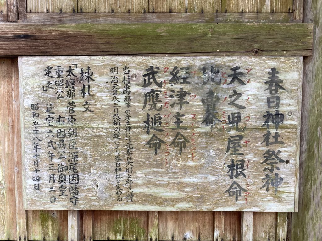 次に、祭神について。この神社は春日神社という、奈良県にある春日大社を総本社としている。そのため、祭られている神も、春日神である。この春日神とは、以下の四神の総称である。