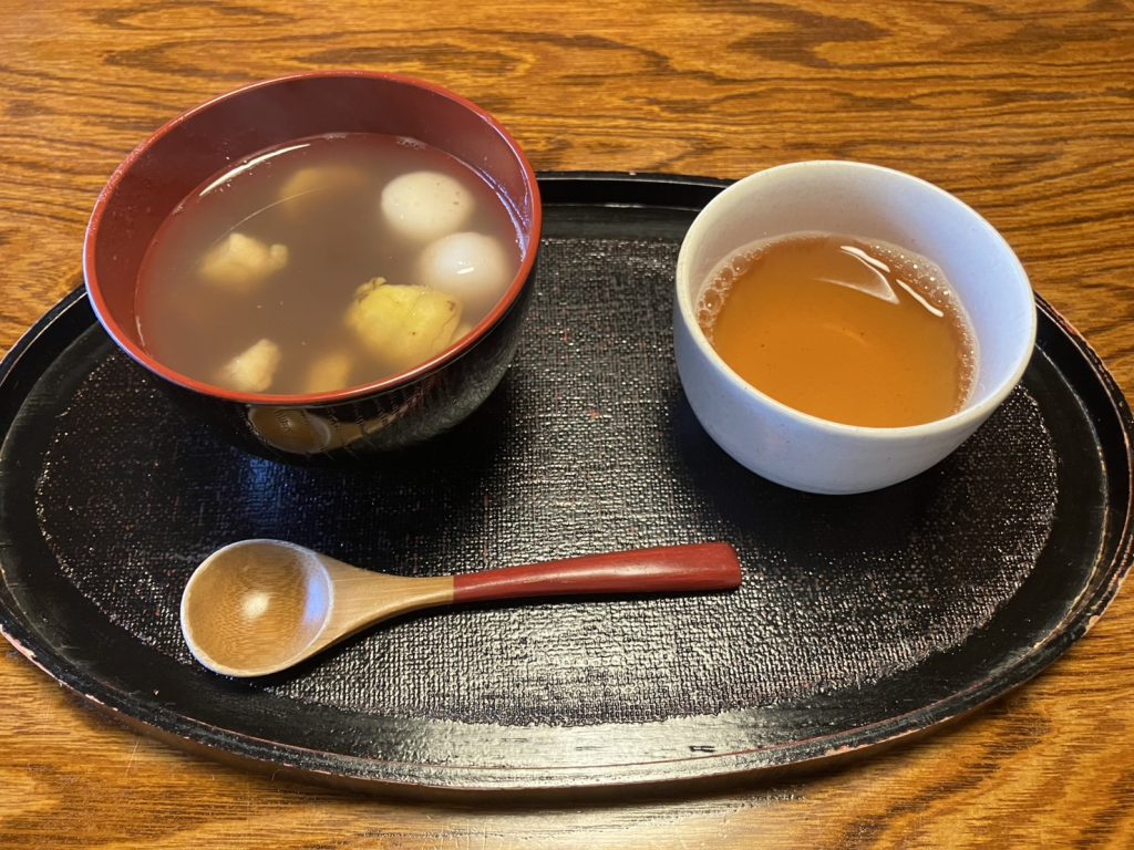 お分かりいただけるだろうか、このTHE・家庭料理感。メニューにあったコンセプトには「『ふつうに美味しい』お家ごはん」と書かれていたが、その通りである。100万ドルの夜景を臨むレストランのコース料理のような、特別な美味しさはない。けれども、のどかで自然豊かな北川村の昼下がり、奈半利川の流れが心地よい中で食べるなら、こういう馴染みのある料理が一番なのではないだろうか。味も「ふつうに美味しい」。デザートとして、白玉ぜんざいゆず風味とゆずジュース(アイス)もいただいた。ぜんざいの中に柚子の皮が入っており、香りを存分に楽しむことができる。またここの店主さんは茶道の師範でもあるらしくメニューには抹茶セットも用意されている。次回訪れた際はぜひいただきたい。