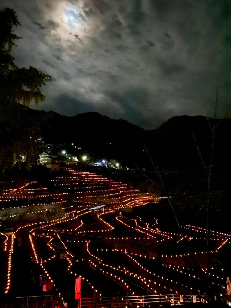日もとっぷりと暮れた頃、いよいよ本日のクライマックス。現地の方が一斉にロウソクへ明かりを灯してゆくと、何層にも連なった棚田が、その輪郭を煌々と暗闇に浮かび上がらせた。まるで灯火の一つひとつが、この地域に生きる人々の思いを静かに映し出しているようだった。その美しさに見惚れていると、自分もこの光景を創り出すのに一役買えたのだと自信を誇らしく思うとともに、何十人もの人たちと協力し合って無事に一つのイベントを完成させられたことに大きな満足感を覚えたのであった。