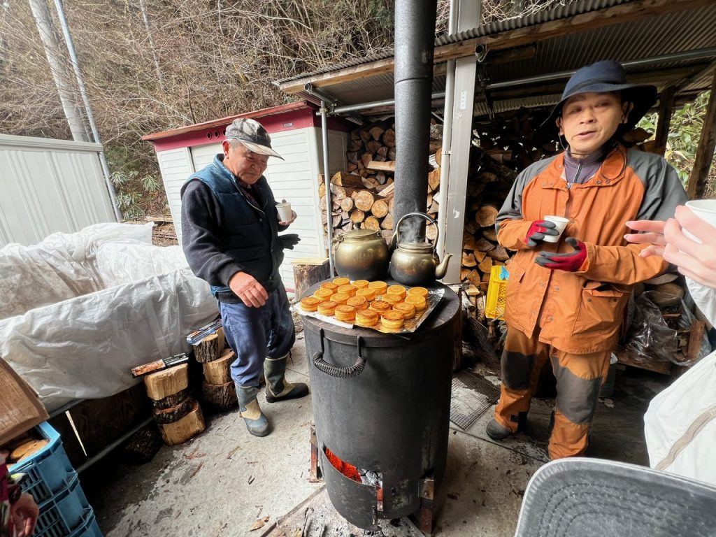 まだ日が昇り切らぬ朝6時30分。前回同様、参加者の面々と高知駅で合流し、タクシーに揺られること約2時間。南国のイメージが強い高知だが、車が山奥へ入っていくにつれ、次第に窓の外で雪がちらつき始めた。現地に到着し、荷物を持って下車。そこで真っ先に私の目へ飛び込んできたのは、大きな薪ストーブを囲んで暖をとりながら談笑している現地の方々の姿だった。当時を振り返ってみると、当時はまいたけへの植菌という初めて挑戦する作業なだけあってすこぶるやる気に満ちていた私だったが、その反面、もしも失敗が続いて他の人の足を引っ張ってしまったらどうしようという不安を抱えたまま当日を迎えていたのもまた事実だ。しかし地域住民の方々が私たちの姿を見るなり、「よう来たねぇ」「やっぱり平地と比べて寒いろ?」とにこやかに話しかけてくださったため、その瞬間、私の中のちっぽけな懸念は一瞬で払拭されたのだった。