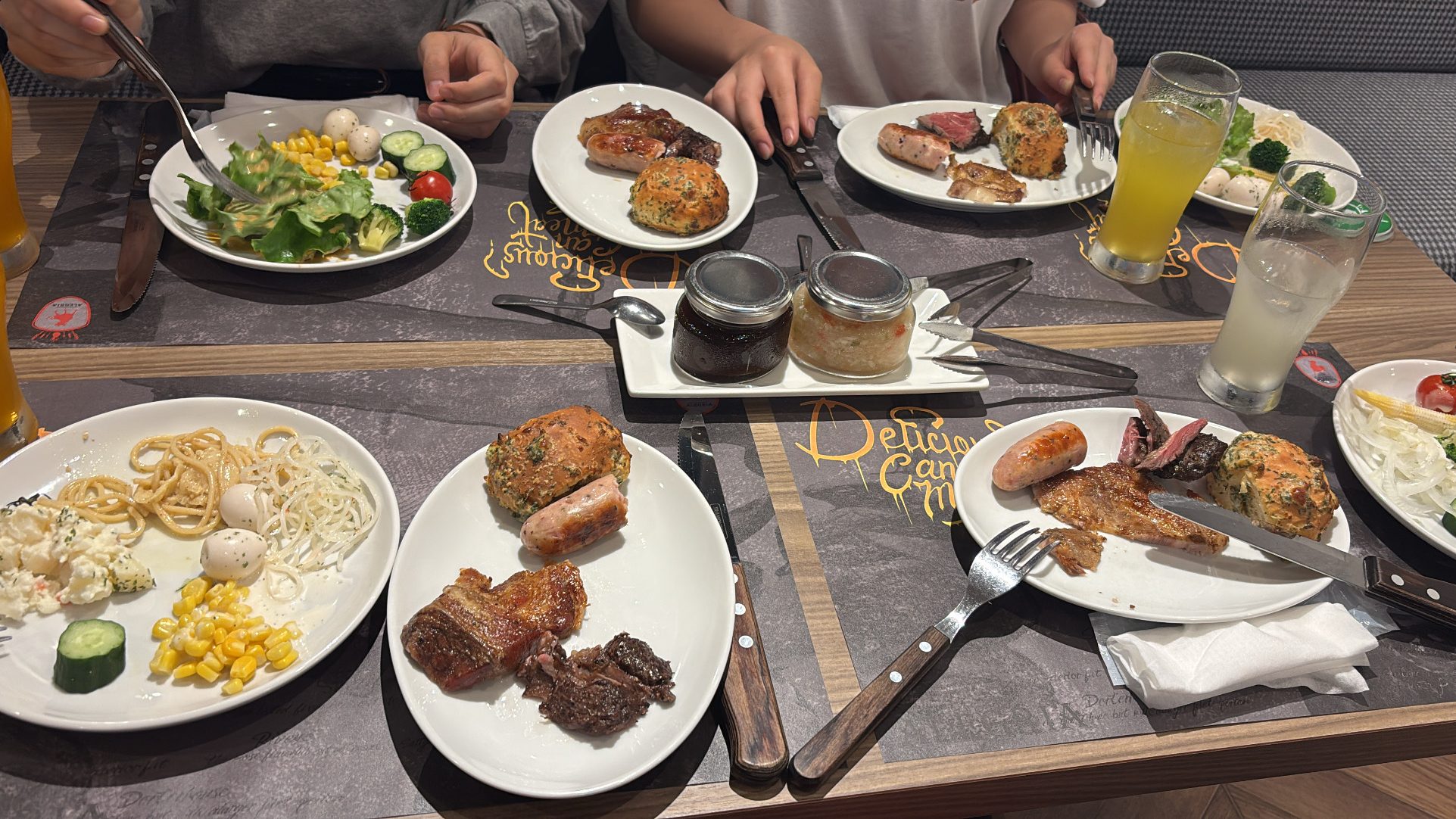 ここでは、ジューシーな牛、豚、鶏をはじめ、焼きチーズやパンまで店員さんが次々とテーブルに届けてくれます。