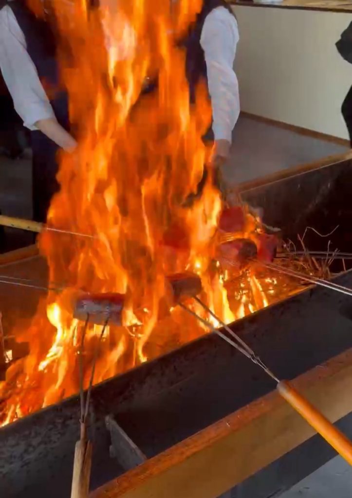 私が行ったときは、まずお店に入ったら店員さんが待ってくれていて、串刺しみたいな道具を渡してくれました。その串にカツオを刺して、いざ火で焼くのですが、これが本当に暑かったです。「おー、これが藁焼きか!」というのを味わうことができました!